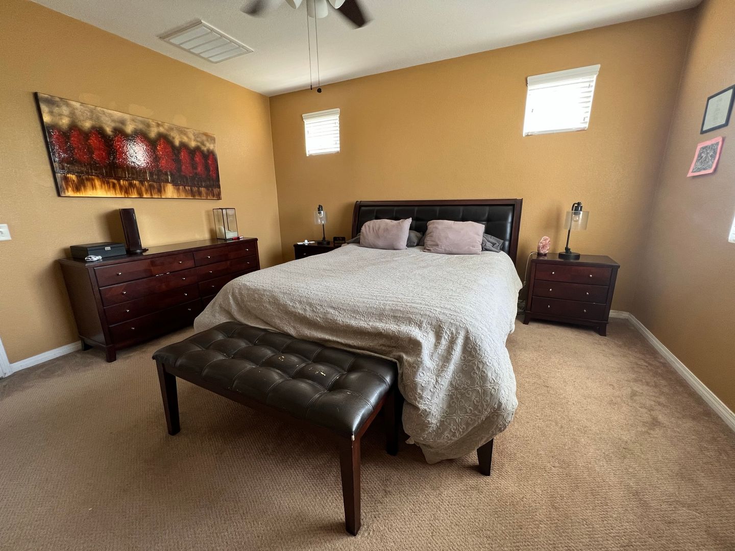 STUNNING 4 + 2.5 TWO – STORY HOME in Fontana CA! Enjoy a gorgeous view of the Fontana hills leading to your new home. Spacious drive way and located in a beautiful quiet neighborhood. This home features a small patio upfront before you walk into an extra large Living Area/Dining Area with windows providing natural lighting. Kitchen features recessed lighting with dishwasher/stove and microwave. An island that provides extra storage space along with plenty of cabinetry for all of our storage needs, extra spacious pantry and tile flooring for easy cleanup. Family room features a gorgeous fireplace with following access to downstairs half bathroom, laundry room, closet and 2 car garage. Second floor provides plenty of family space with a loft and built in work desk. All 3 bedrooms feature extra large roll door closets. 2 bedrooms have built in window seats with clear view of the Fontana hills. Primary bedroom is extra spacious with a gorgeous bathroom featuring dual sinks, private toilet room stand up shower and spa with walk in closet. This home also features an adorable outdoor patio and plenty of yard space for the family. Washer/Dryer included, Central AC/HEATING, Security camera access and landscaping included. With short drive access to surrounding dining/entertainment/shops, community parks and re centers, located near 15 freeway. CALL US OR APPLY TODAY! DRE# 01383297. ALL applicants must complete a PetScreening Profile even if the household does not have a pet/animal. https://utopiacorona.petscreening.com/
