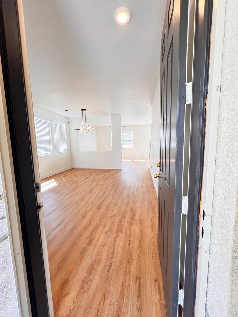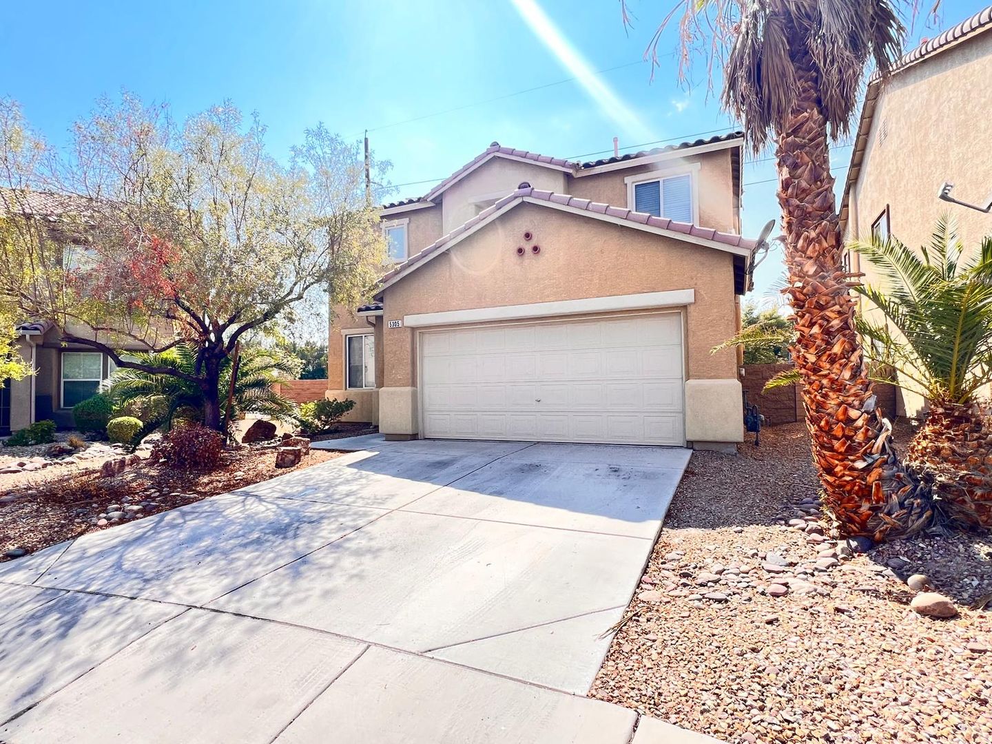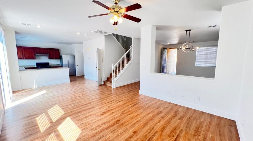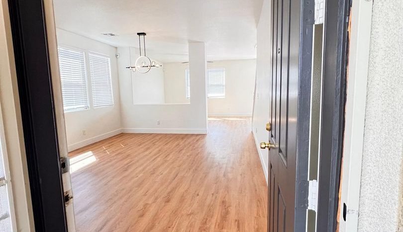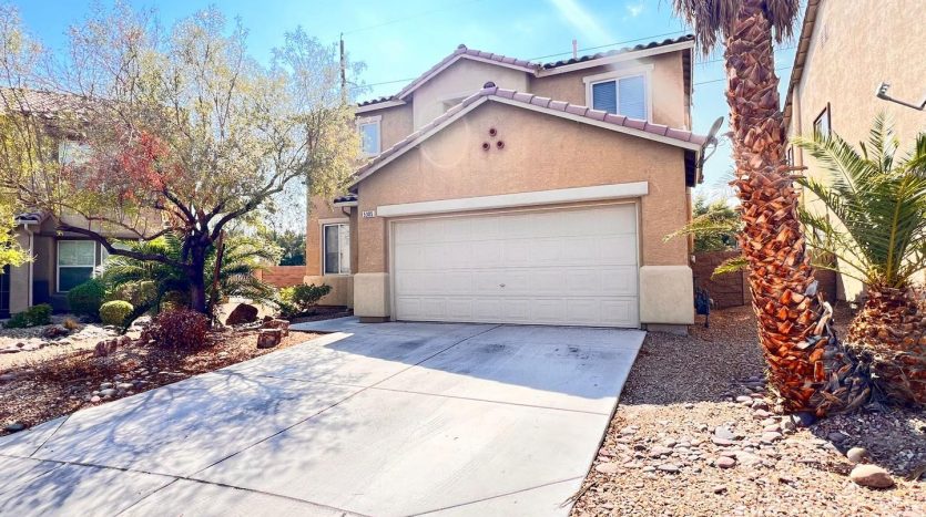Delightful two-story, 3-bedroom, 2.5-bath home in North Las Vegas! Terrific curb appeal with a welcoming front porch that leads into a combined living and dining area. A pony wall separates the living space from the cozy family room. The kitchen features granite countertops, appliances, a breakfast bar, pantry, and a charming garden window. Laundry is conveniently located on the main level. All bedrooms are upstairs, including an oversized primary suite with a walk-in closet and space for a sitting area. The primary bath offers dual sinks, a garden tub, and a walk-in shower. Enjoy a large backyard with a patio, plus a driveway leading to a two-car garage.